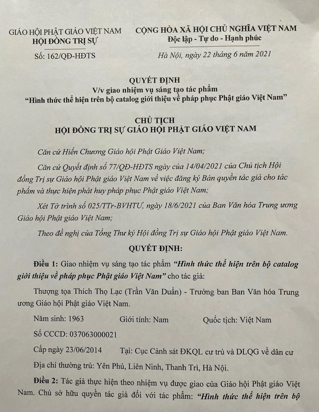 Theo Quyết định số 162/QĐ-HĐTS do Chủ tịch Hội đồng Trị sự GHPGVN Hòa thượng Thích Thiện Nhơn ấn ký ban hành ngày 22-6-2021, Giáo hội giao cho Ban Văn hóa Trung ương sáng tạo tác phẩm “Hình thức thể hiện trên bộ catalog giới thiệu về pháp phục Phật giáo Việt Nam”. Đồng thời, thực hiện đăng ký bản quyền tác giả và các quyền của chủ sở hữu tác phẩm trong 7 năm (kể từ ngày quyết định này có hiệu lực).