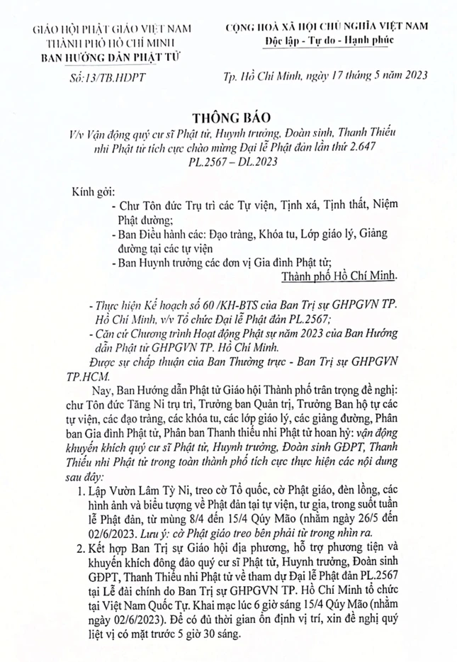 Thông báo gởi đến chư tôn đức trụ trì các tự viện, tịnh xá, tịnh thất, niệm Phật đường; Ban Điều hành các đạo tràng, khóa tu, lớp giáo lý, giảng đường tại các tự viện; Ban Huynh trưởng các đơn vị Gia đình Phật tử TP.HCM tích cực hưởng ứng Tuần Phật đản.