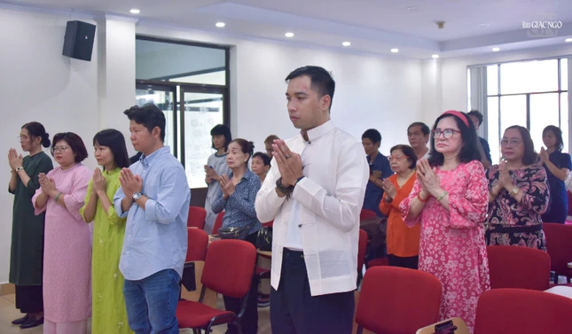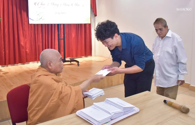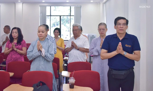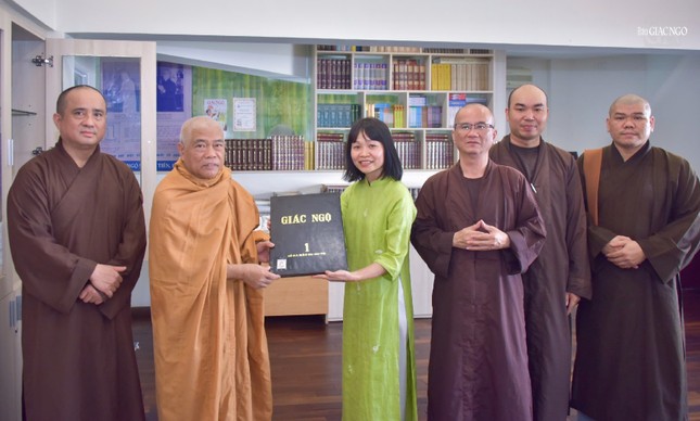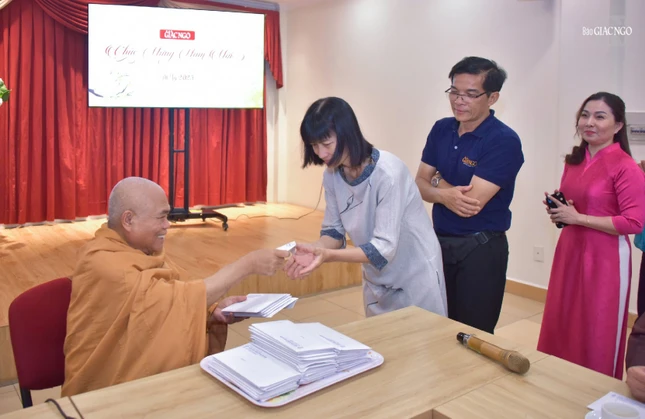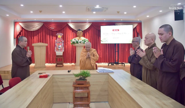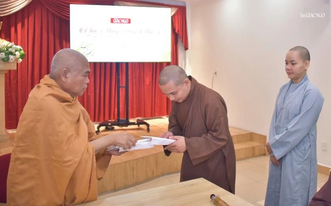 Tại hội trường, Thượng tọa Thích Chúc Phú, Phó Thư ký tòa soạn đại diện dâng lời chúc khánh tuế năm mới lên Hòa thượng Thích Giác Toàn, Phó Chủ tịch Hội đồng Trị sự, Viện trưởng Viện Nghiên cứu Phật học VN, nguyên Quyền Tổng Biên tập Báo Giác Ngộ.
