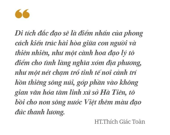 - Điểm nhấn của công trình kiến trúc tại đây chính là nơi ghi nhận dấu tích một thời của một vị chân sư chứng đạo. Từ đó, ngài dấn thân hoằng hóa độ sanh mà vạch xuất phát lại là ghềnh đá Mũi Nai - Hà Tiên. Dấu tích nơi Tổ sư ngồi tu thiền định thuở xưa cạnh bờ biển, với triền núi trải dài, do vậy, khi tôn tạo di tích tôi đã cho xây dựng bức tường chắn vách núi để khắc họa tiểu sử Tổ sư và tiểu sử thi hóa, cùng các bài tưởng niệm Tổ sư vắng bóng v.v… bằng chữ đồng.