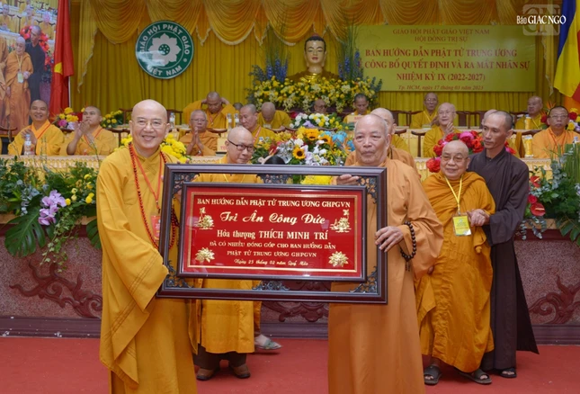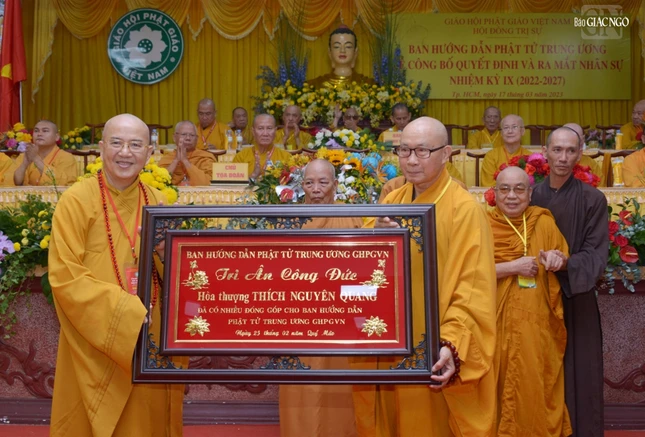 Nhân dịp này, Ban Tổ chức trao tặng khánh vàng tri ân chư tôn đức hoàn thành xuất sắc công tác Phật sự Ban Hướng dẫn Phật tử T.Ư nhiệm kỳ VIII.