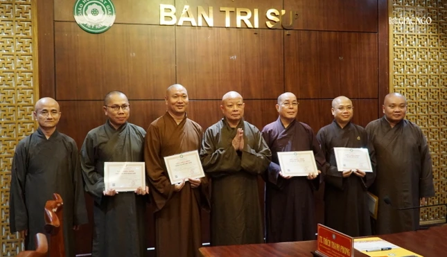 Dịp này, Hòa thượng Trưởng ban Trị sự TP.HCM trao giấy chứng nhận đến chư tôn đức được cử tham gia Khóa bồi dưỡng về Giới luật Phật giáo năm 2024 do Ban Tăng sự T.Ư tổ chức tại tỉnh Bình Dương vừa qua.
