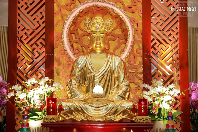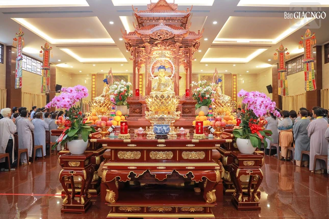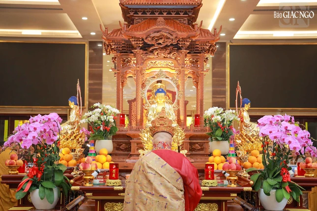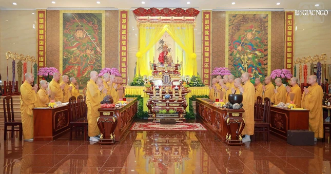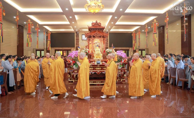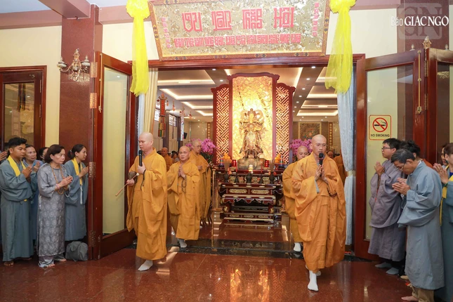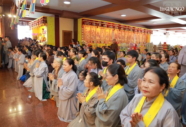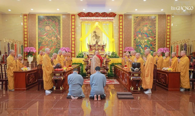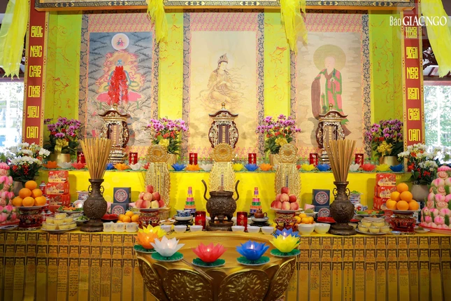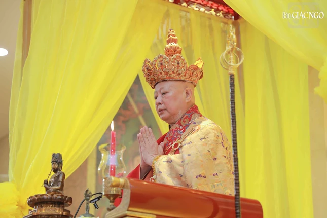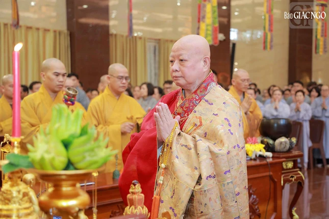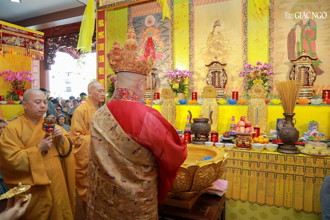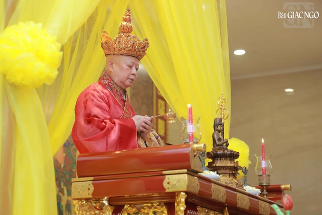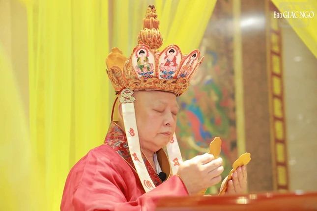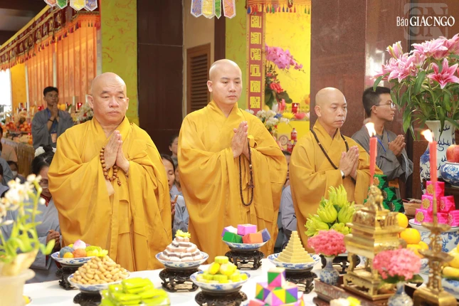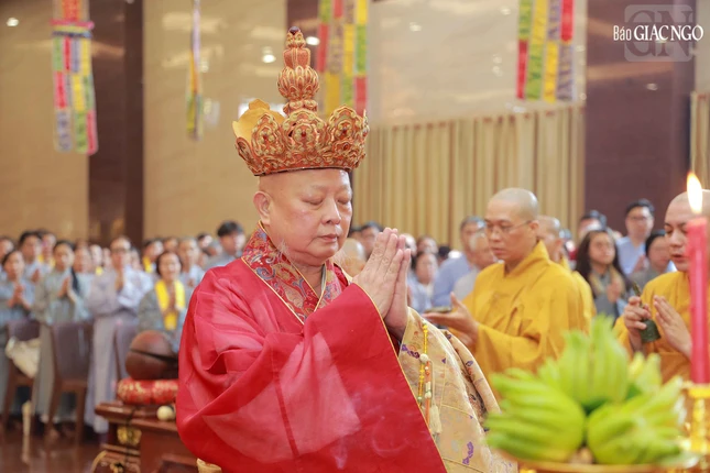 Hòa thượng Thích Lệ Trang, Phó Chủ tịch Hội đồng Trị sự, Trưởng ban Nghi lễ T.Ư, Trưởng ban Trị sự GHPGVN TP.HCM đương vi gia trì sư; cùng chư tôn đức Ban Nghi lễ, Ban Trị sự GHPGVN TP.HCM thực hiện khóa lễ theo khoa nghi Cam lộ thí thực.