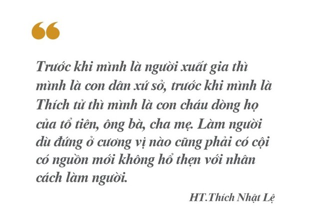 Có nhiều năm Ôn xin Ôn Linh Quang cho tôi đi theo về thăm quê. Tôi thấy Ôn rất mẫu mực trong vấn đề hiếu đạo đối với thầy tổ, cha mẹ và bà con quyến thuộc, làng xóm quê hương. Ôn nặng lòng với xứ sở nên khi quê hương có việc gì đột xuất Ôn đều có mặt dù hoàn cảnh khó khăn đến mấy. Ôn thường nói với tôi, rằng: “Trước khi mình là người xuất gia thì mình là con dân xứ sở, trước khi mình là Thích tử thì mình là con cháu dòng họ của tổ tiên, ông bà, cha mẹ. Làm người dù đứng ở cương vị nào cũng phải có cội có nguồn mới không hổ thẹn với nhân cách làm người”.