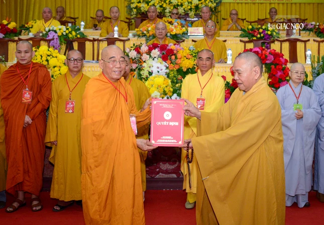 Hòa thượng Thích Thiện Nhơn trao quyết định đến Trưởng ban Từ thiện xã hội T.Ư, Hòa Thượng Thích Quảng Tùng