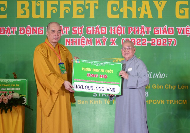 Tại buổi khai mạc buffet chay, Hòa thượng Thích Lệ Trang tặng đến Ban Tổ chức tôn tượng Đức Bổn Sư Thích Ca Mâu Ni. Ban Tổ chức tiếp nhận sự ủng hộ của Ban Thường trực Ban Trị sự GHPGVN TP.HCM 100 triệu đồng, Phân ban Ni giới TP.HCM cúng dường 100.000 triệu; Ni trưởng Thích nữ Từ Nhẫn, Trưởng Phân ban Ni giới TP.HCM, trụ trì chùa Phước Viên cúng dường 100 triệu đồng, chùa Pháp Võ ủng hộ 100 triệu đồng, cùng sự ủng hộ tài chính của lãnh đạo các ban chuyên môn, Ban Trị sự TP.Thủ Đức, các quận huyện, các tự viện…