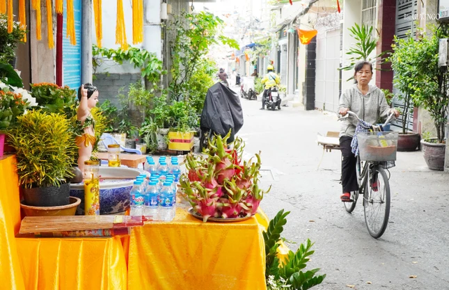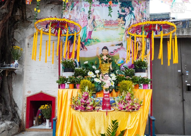 Phật tử Diệu Tịnh (67 tuổi, nhà ở hẻm 159 Trần Văn Đang, Q.3) cho biết bắt đầu thiết trí lễ đài từ 6 năm nay. Do đó, khi thiết trí, nhiều bà con trong hẻm cũng đã cùng góp công sức, rồi người cúng hoa, người cúng nhang, trái cây, tạo nên không khí rất ấm áp quanh lễ đài.