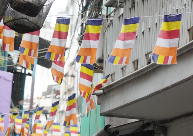 GNO - Cờ Phật giáo, hoa sen, trái cây, nhang đèn, cùng sự góp công sức của mọi người quanh hẻm 159, 113 đường Trần Văn Đang (Q.3, TP.HCM) - nơi thiết trí lễ đài Phật đản do Phật tử Diệu Tịnh và Võ Đăng Dũng phát tâm đã tạo nên lễ đài trang nghiêm, ấm áp, hoan hỷ đón Phật về giữa nhân gian.