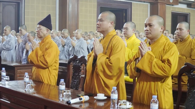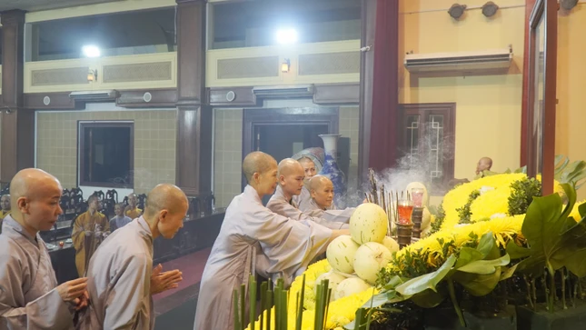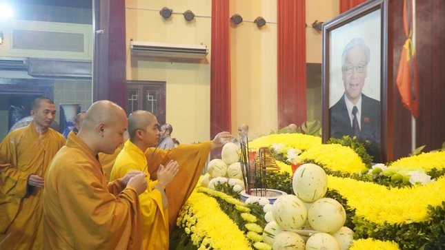 Trong không khí trang nghiêm, toàn thể đại chúng đã dâng hương, dành một phút nhập từ bi quán tưởng niệm, trì tụng kinh A Di Đà, niệm Phật, nhất tâm cầu nguyện anh linh Tổng Bí thư Nguyễn Phú Trọng siêu sinh cõi lành.