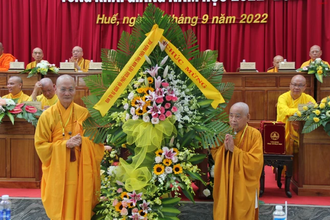 Dịp này, Học viện đón nhận nhiều lẵng hoa chúc mừng và trao học bổng đến các Tăng Ni sinh ưu tú hiện đang theo học các khóa, các cấp đào tạo.