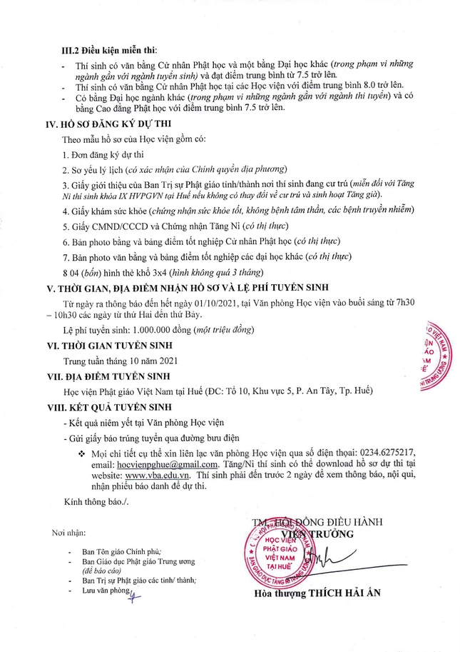 Thời gian nhận hồ sơ từ ngày ra thông báo đến hết ngày 1-10-2021, văn phòng Học viện Phật giáo VN tại Huế. Lệ phí tuyển sinh 1 triệu đồng.