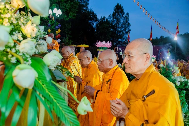 Giờ phút thiêng liêng của Đại lễ, chư tôn đức Hội đồng Chỉ đạo, Hội đồng Điều hành Học viện, Giáo thọ sư, giảng viên, học viên, Tăng Ni sinh và thiện tín Phật tử đã thành kính niêm hương trước kim thân Đức Phật sơ sinh, đồng hướng niệm đến công hạnh của Bồ-tát Thích Quảng Đức vị pháp thiêu thân góp phần bảo vệ Phật giáo Việt Nam được trường tồn.