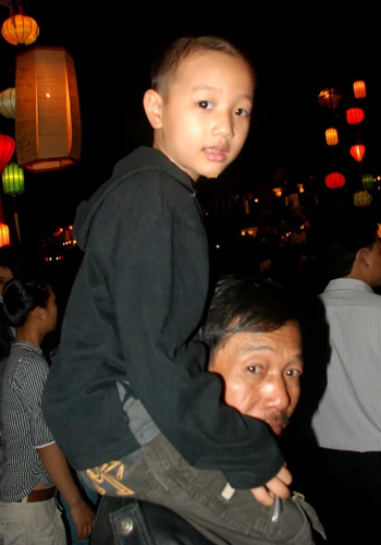 Người lớn cõng trẻ con đi xem lễ hội đèn lồng ở Hội An.