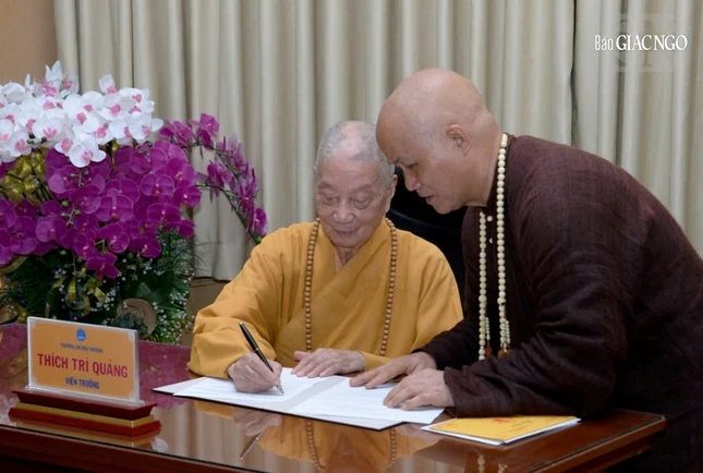 Trước đó, thay mặt Hội đồng Điều hành Học viện, Thượng tọa Thích Giác Dũng, Phó Viện trưởng, Trưởng khoa Luật học Phật giáo đại diện dâng lời khánh tuế đầu năm đến Đại lão Hòa thượng Viện trưởng.