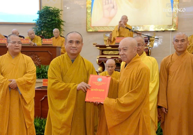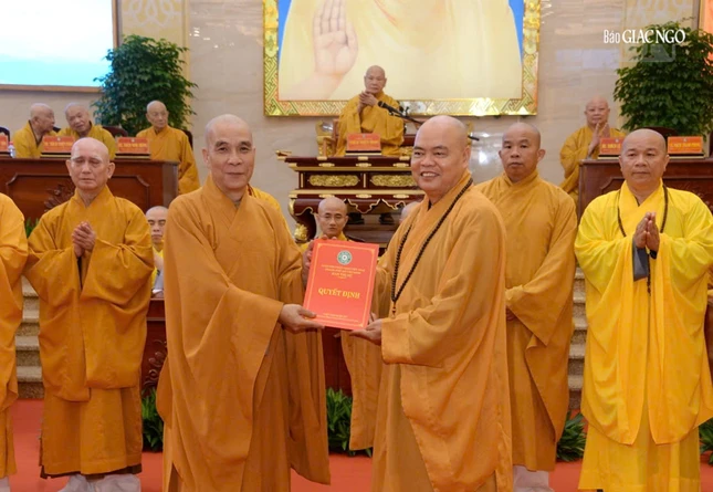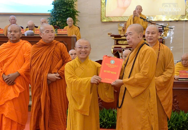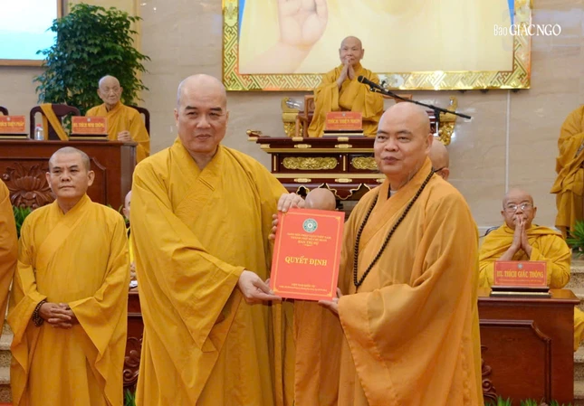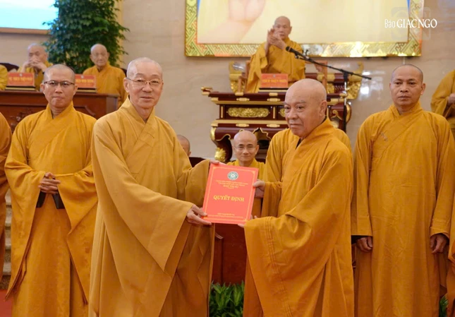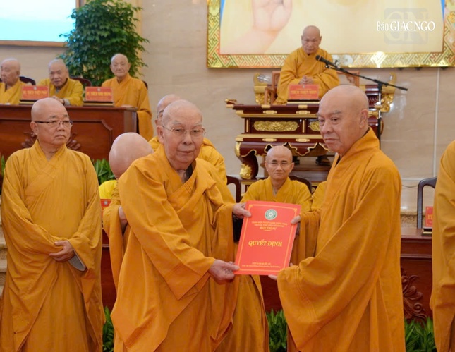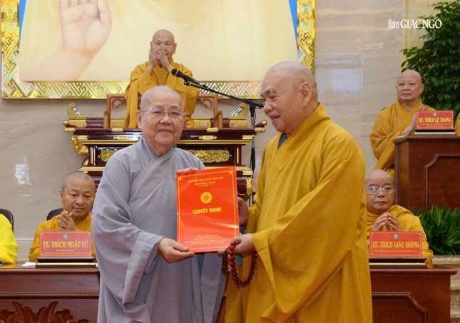 Trưởng lão Hòa thượng Thích Thiện Pháp trao quyết định Trưởng ban Trị sự GHPGVN TP.HCM đến Hòa thượng Thích Lệ Trang - Ảnh: Bảo Toàn/BGN