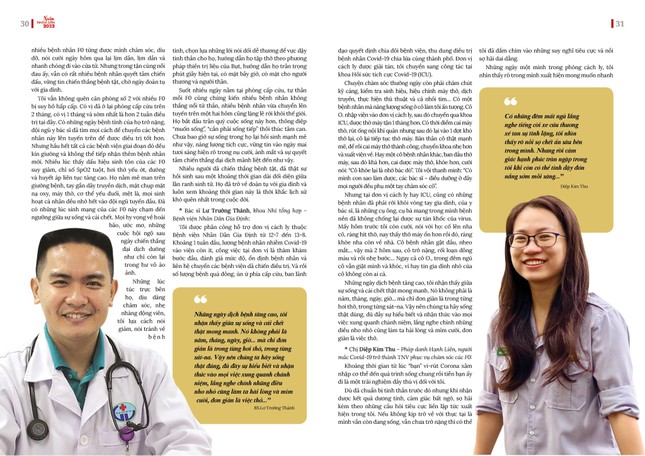 Chuyện chăm sóc thường ngày còn phải chăm chút kỹ càng, kiểm tra sinh hiệu, hiệu chỉnh máy thở, dịch truyền, thực hiện thủ thuật và cả nhồi tim… Có một bệnh nhân mà năng lượng sống ở cô làm tôi ấn tượng. Cô O. nhập viện vào đơn vị cách ly, sau đó chuyển qua khoa ICU, được thở máy tận 1 tháng hơn. Có thời điểm cai máy thở, rút ống nội khí quản nhưng sau đó lại vào 1 đợt khó thở lại, cô lại tiếp tục thở máy. Bản thân cô thật mạnh mẽ, để rồi cai máy thở thành công, chuyển khoa nhẹ hơn và xuất viện về. Hay một cô bệnh nhân khác, ban đầu thở máy, sau đó khá hơn, cai được máy thở, khỏe hơn, cười nói: “Cô khỏe lại là nhờ bác đó”. Tôi vội thanh minh: “Có mình con sao làm được, các bác sĩ - điều dưỡng ở đây mọi người đều phụ một tay chăm sóc cô”.