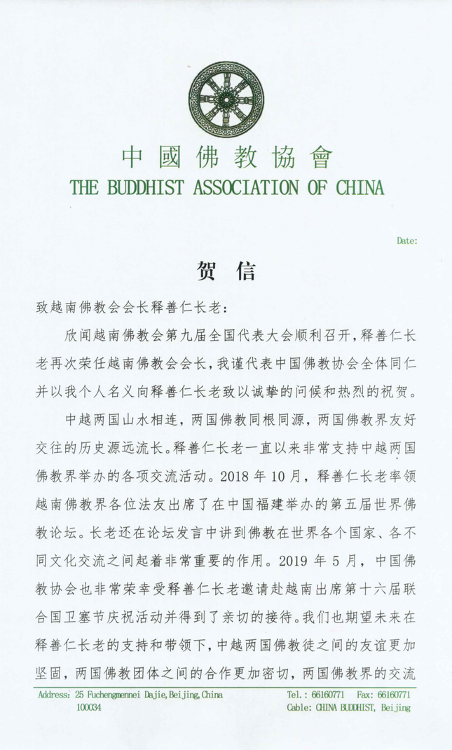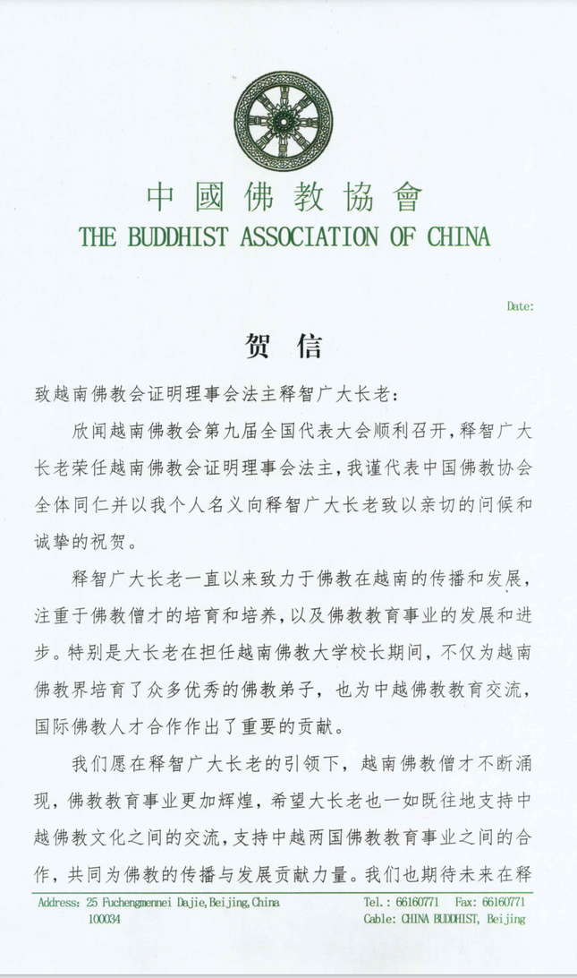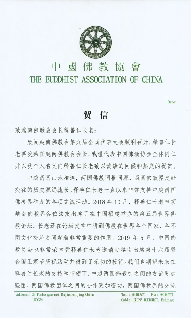 Theo đó, thư chúc mừng của Trưởng lão Hòa thượng Thích Diễn Giác, Hội trưởng Hiệp hội Phật giáo Trung Quốc ấn ký kính gửi đến Đại Trưởng lão Hòa thượng Thích Trí Quảng, Pháp chủ Hội đồng Chứng minh và Trưởng lão Hòa thượng Thích Thiện Nhơn, Chủ tịch Hội đồng Trị sự Giáo hội Phật giáo Việt Nam.