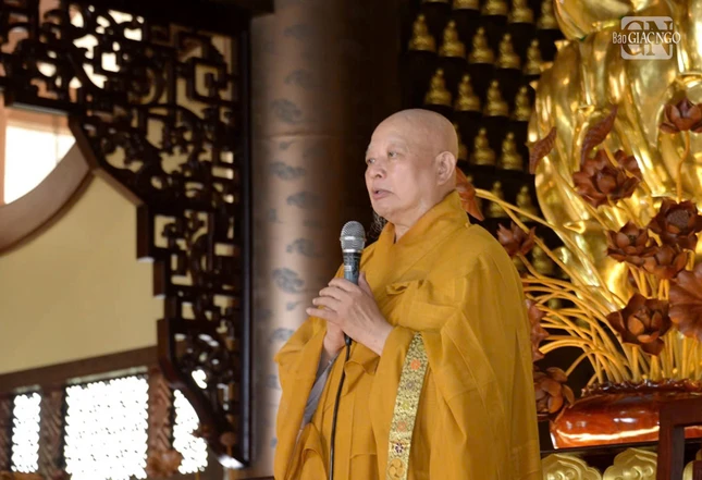 Hòa thượng Thích Lệ Trang, trụ trì chùa Huê Nghiêm truyền pháp y và có thời pháp thoại chia sẻ về ý nghĩa của việc quy y, ý nghĩa Tam bảo cùng những lợi lạc của người cư sĩ tại gia khi thọ trì 5 giới căn bản.
