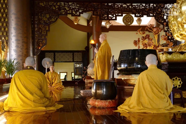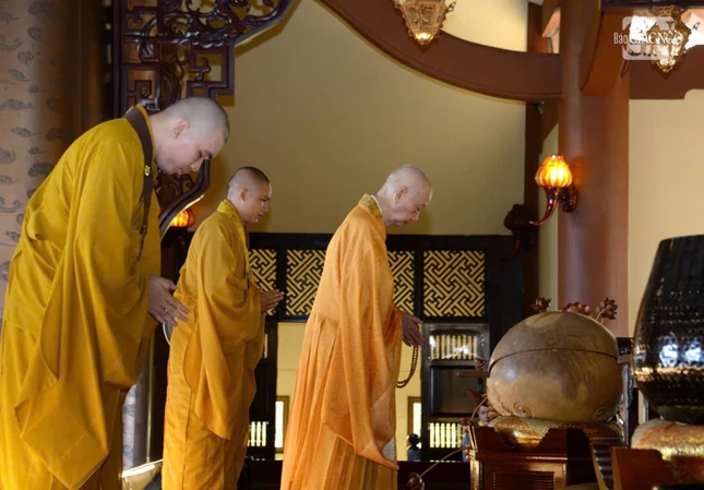 Đại lão Hòa thượng Thích Trí Quảng, viện chủ chùa Huê Nghiêm thân lâm niêm hương bạch Phật, hướng dẫn đại chúng sám hối và phát nguyện quy y Tam bảo.