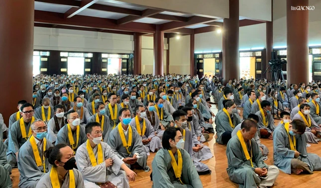 Phật tử ngồi kín cả giảng đường, buổi thuyết giảng được truyền tín hiệu âm thanh và hình ảnh xuống các sảnh cho Phật tử đến nghe pháp.