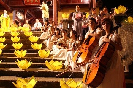Đặc biệt, tại buổi lễ có sự góp mặt của các bạn SV Học viện Âm nhạc Huế với tiếng đàn violon và dương cầm du dương. Các ca khúc êm ái, hiền hòa được hát lên chào mừng ngày mở đầu của Tuần lễ Phật đản năm nay.