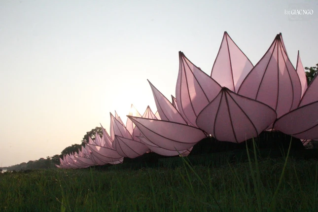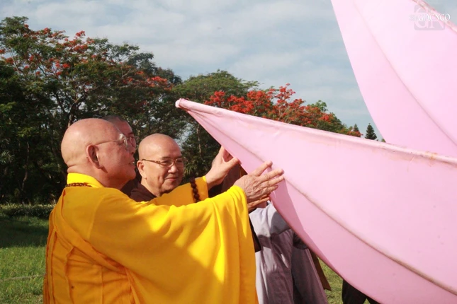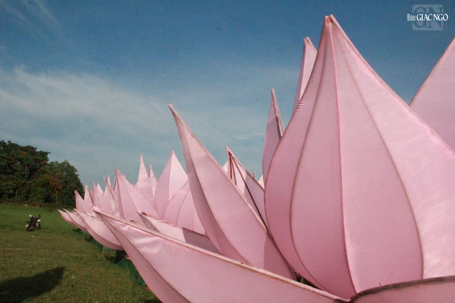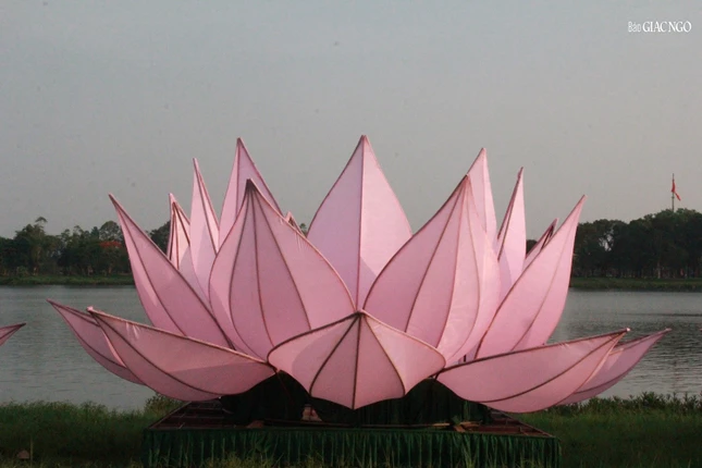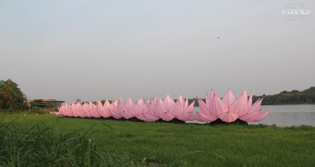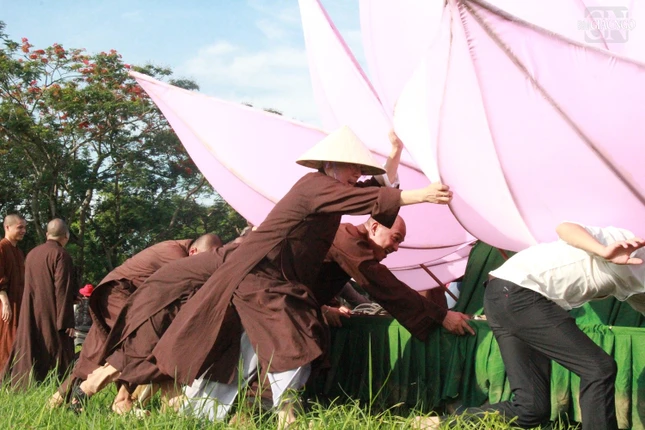 Trước đó, 168 cánh sen được Ni sinh Học viện Phật giáo VN tại Huế thực hiện dán vải lên các bộ khung sườn cánh sen, sau đó di chuyển từ Học viện về tập kết tại công viên bia Quốc Học.