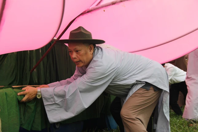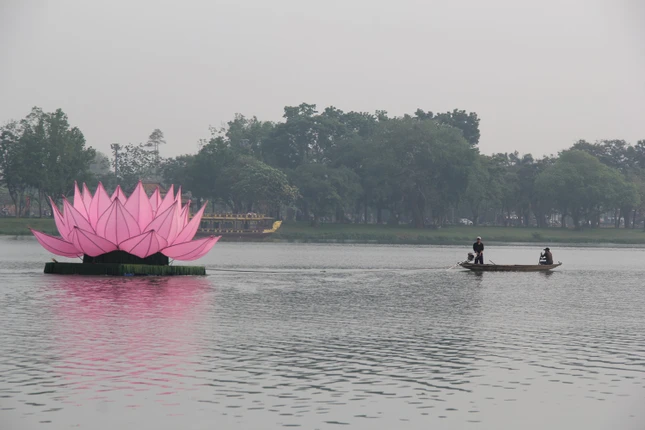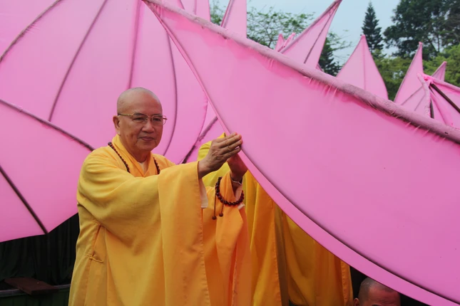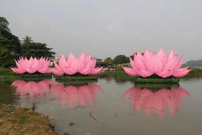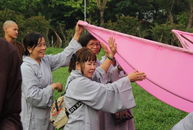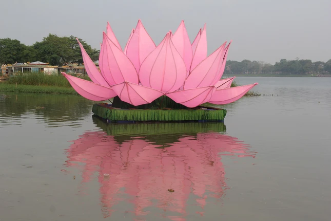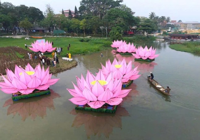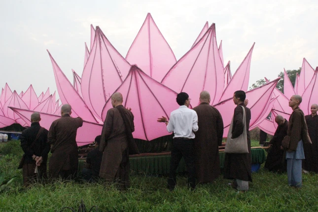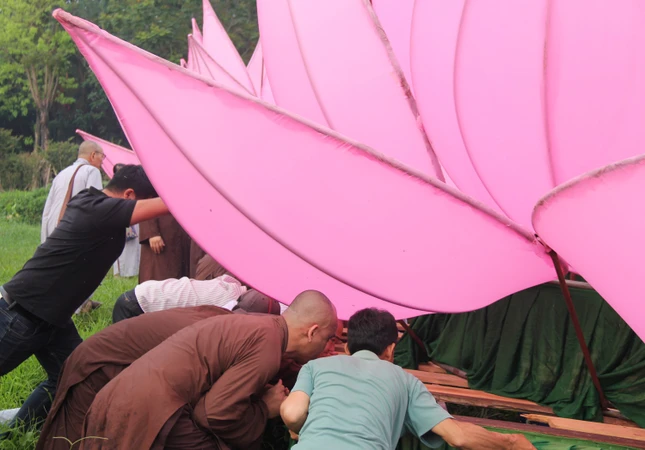 Trước đó, 168 cánh sen được Ni sinh Học viện Phật giáo VN tại Huế thực hiện dán vải lên bộ khung sườn. Sau đó vận chuyển từ Học viện Phật giáo VN tại Huế về tập kết tại bờ sông Hương.