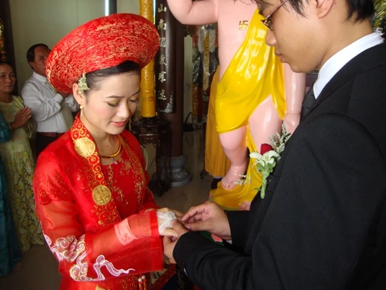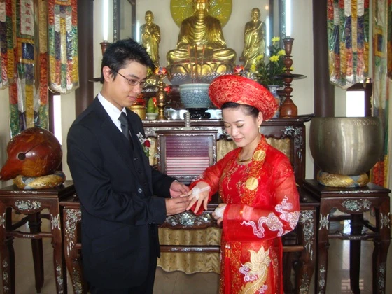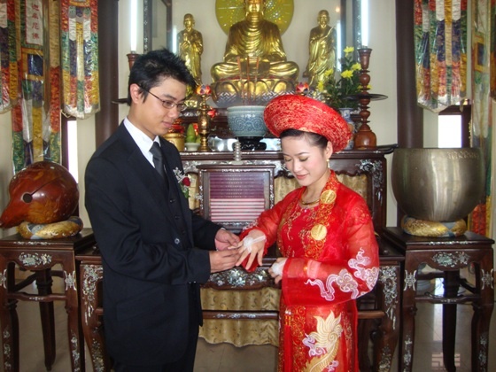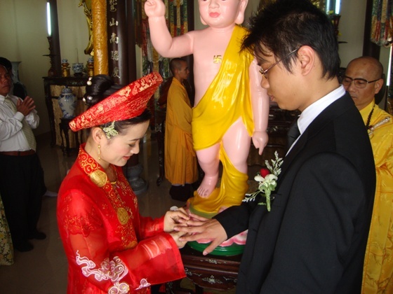 Cuối buổi lễ, TT. Thích Tâm Pháp, thay mặt cho chư tôn đức Tăng chứng minh và gia đinh đã trao tặng cho 2 người 2 chiếc nhẫn làm vật kỷ niệm.