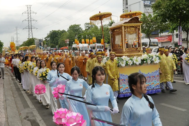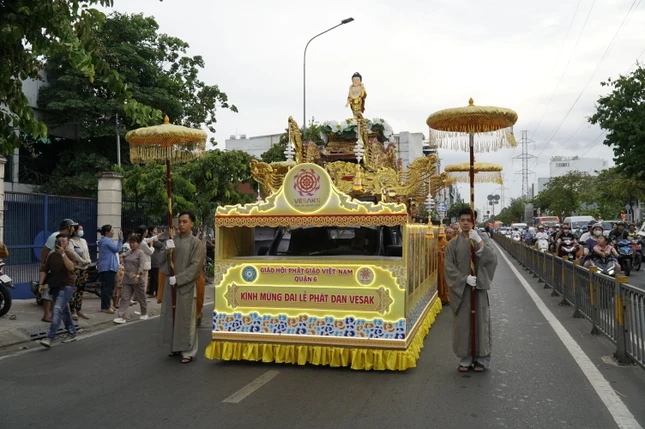 Tôn tượng Đức Phật sơ sinh được rước trang trọng trong kiệu, tỏa sắc vàng dưới ánh nắng chiều lung linh, dưới tiếng kệ trầm hùng của chư tôn đức và âm thanh thanh thoát của trống Bát-nhã. Những bước chân nhẹ nhàng, chậm rãi của các Phật tử trẻ đã tạo nên một bức tranh sống động giữa lòng thành phố nhộn nhịp. Những người con Phật, không chỉ cất bước trên đường phố mà còn bước đi trên con đường tâm linh, trong sự tôn kính và chánh niệm.