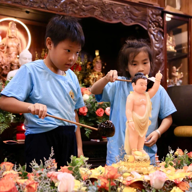 Dưới sự hướng dẫn của chư Tăng, các em thiếu nhi thực hiện nghi thức Tắm Phật trong sự tĩnh lặng và thành kính. Hình ảnh những gương mặt rạng ngời, đôi tay nhỏ bé cẩn trọng rưới những dòng nước thơm lên kim thân Đức Phật đã tạo nên khoảnh khắc đẹp và xúc động trong mùa Phật đản.