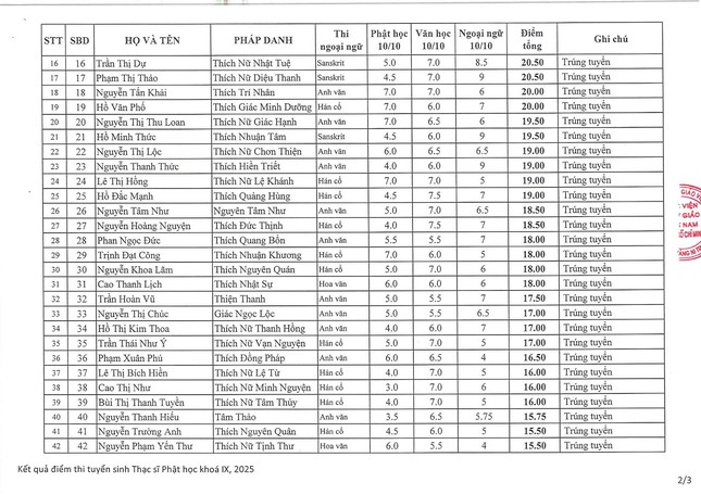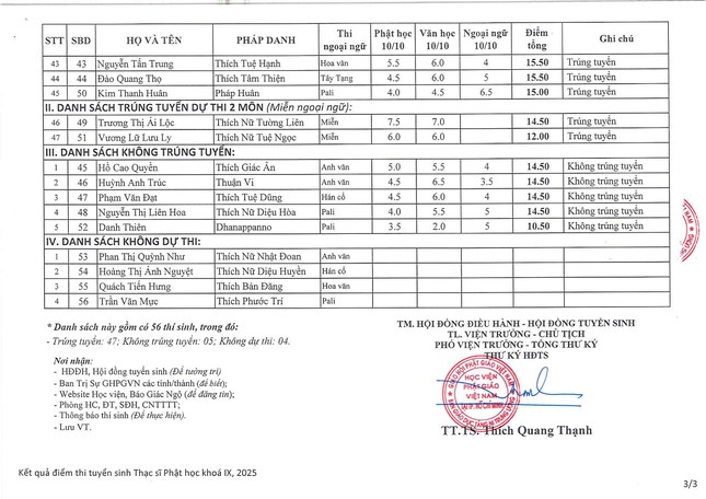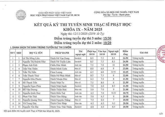 GNO - Thông tin từ Văn phòng Học viện Phật giáo VN tại TP.HCM gởi đến Báo Giác Ngộ cho biết, thừa lệnh Hòa thượng Viện trưởng, Thượng tọa Thích Quang Thạnh, Phó Viện trưởng kiêm Tổng Thư ký Hội đồng Điều hành Học viện vừa ký công bố kết quả tuyển sinh thạc sĩ Phật học khóa IX - năm 2025.