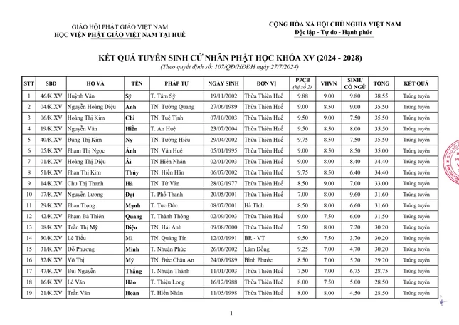 Theo đó, điểm trúng tuyển cử nhân Phật học khóa XV (2024-2028) là 15/30, môn Phật pháp căn bản (hệ số 2), Văn học Việt Nam và Ngoại ngữ (hệ số 1).