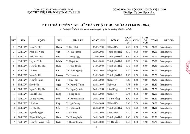Giác Ngộ online giới thiệu đến chư Tăng Ni, bạn đọc quan tâm kết quả tuyển sinh cử nhân Phật học khóa XVI (2025-2029) của Học viện Phật giáo VN tại Huế: