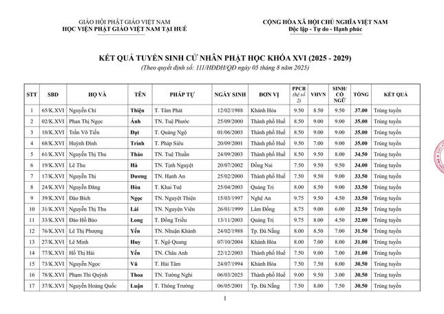 Theo đó, điểm trúng tuyển cử nhân Phật học khóa XVI (2025-2029) là 18/40, môn Phật pháp căn bản (hệ số 2), Văn học Việt Nam và Ngoại ngữ (hệ số 1).
