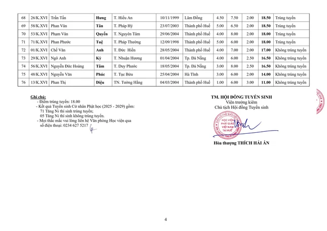 GNO - Hòa thượng Thích Hải Ấn, Ủy viên Thường trực Hội đồng Trị sự, Viện trưởng Học viện Phật giáo VN tại Huế vừa ấn ký công bố kết quả tuyển sinh cử nhân Phật học khóa XVI (2025-2029).