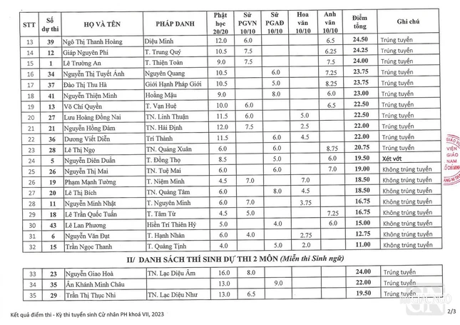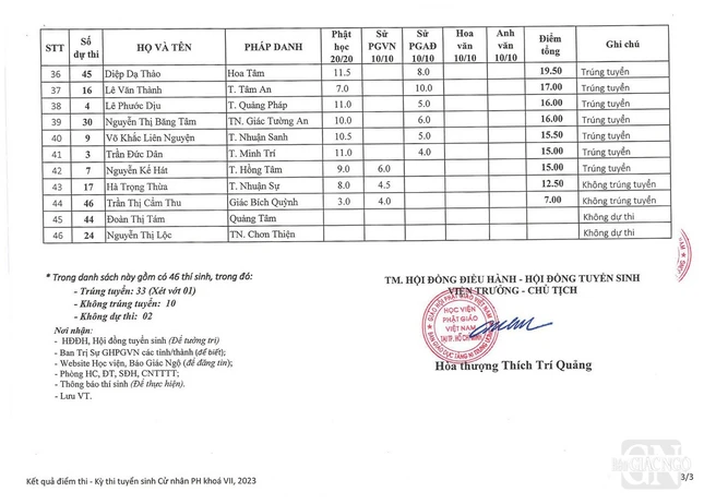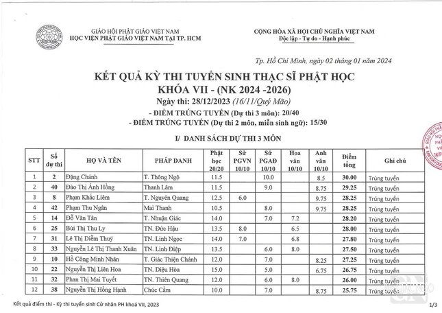 GNO - Thông tin chính thức của Văn phòng Học viện Phật giáo VN tại TP.HCM cung cấp cho Báo Giác Ngộ, hôm nay, ngày 2-1, Đại lão Hòa thượng Thích Trí Quảng, Viện trưởng Học viện đã ấn ký công bố kết quả tuyển sinh Thạc sĩ Phật học khóa VII (2024-2026).