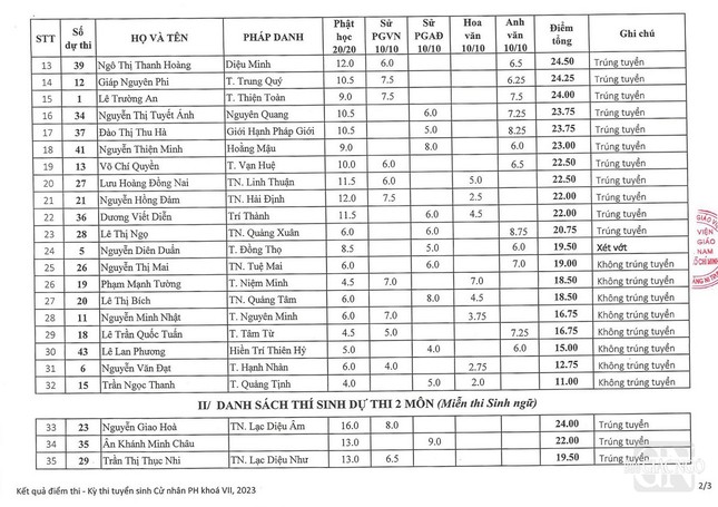 Theo đó, điểm trúng tuyển Thạc sĩ Phật học: thi 3 môn là 20/40; thi 2 môn (miễn sinh ngữ) là 15/30.