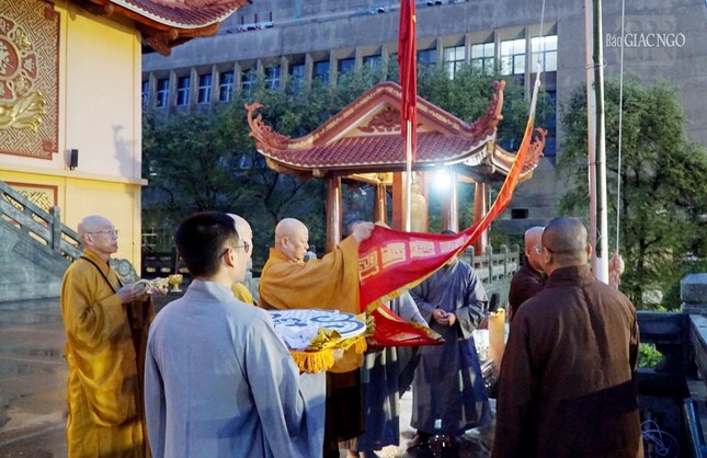 Chư tôn đức cũng thực hiện nghi thức thượng phan; thắp hương tưởng niệm tại Bia tưởng niệm chiến sĩ, các y bác sĩ, tình nguyện viên, đồng bào qua đời trong đại dịch Covid-19, trong khuôn viên Việt Nam Quốc Tự.