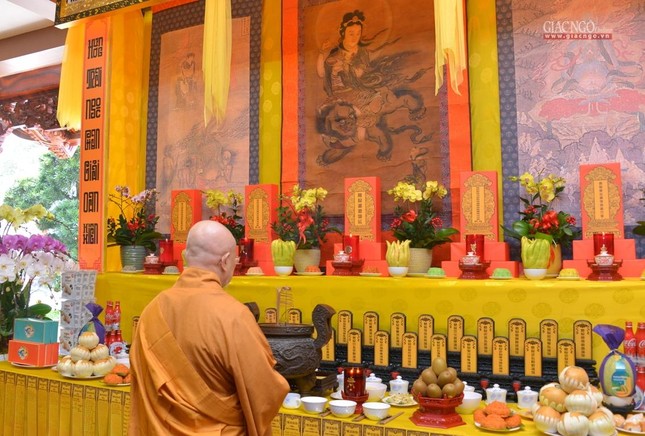 Trong không gian tâm linh của đàn tràng, Hòa thượng Thích Lệ Trang, Trưởng ban Trị sự GHPGVN TP.HCM đã niêm đàn sái tịnh, bạch Phật khai kinh; Thượng tọa Thích Quảng Chơn, cùng chư tôn đức Ban Nghi lễ TP.HCM thực hiện các nghi thức thỉnh Tiêu Diện Đại sĩ, cùng với sự tham dự của chư tôn đức các hệ phái Phật giáo, Phật tử các đạo tràng, thân nhân các gia đình có người thân qua đời trong đại dịch Covid-19 tham dự trang nghiêm tại đàn tràng, nhất tâm hiệp lực cầu nguyện.