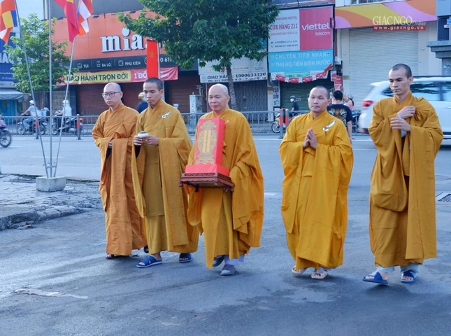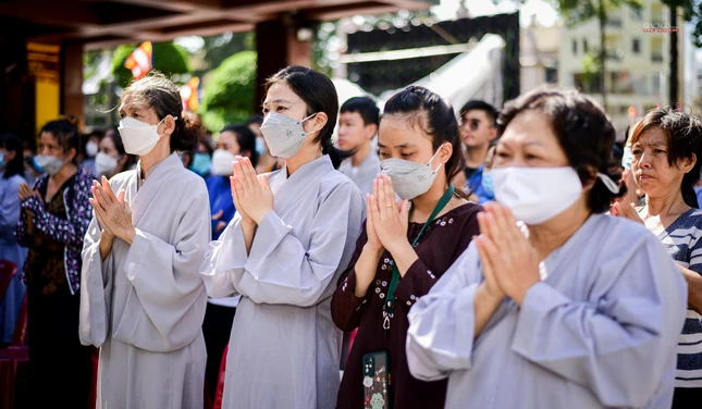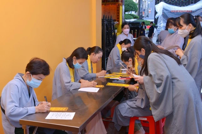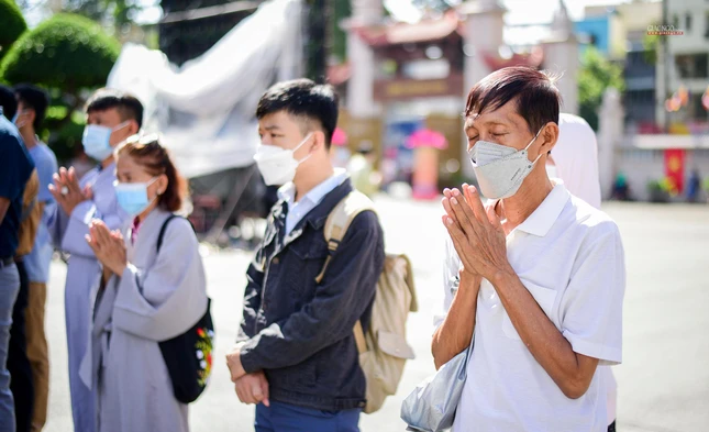 Từ rất sớm, thân nhân những người không may qua đời trong đại dịch Covid-19 từ các quận huyện đã có mặt tại Việt Nam Quốc Tự cung đón các đoàn chư tôn đức Ban Trị sự GHPGVN TP.Thủ Đức, 21 quận huyện thỉnh linh vị chư hương linh đồng bào tử vong, cán bộ, chiến sĩ hy sinh từ các bệnh viện dã chiến trong đại dịch Covid-19 về an vị tại đàn tràng Việt Nam Quốc Tự.