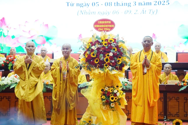 Thượng tọa Thích Phước Nguyên trao lẵng hoa chúc mừng của Hội đồng Trị sự |