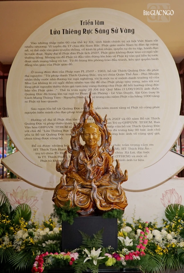 Triển lãm “Lửa thiêng rực sáng sử vàng” trưng bày một số hình ảnh, tư liệu về cuộc đời và đạo nghiệp của Bồ-tát Thích Quảng Đức, những di vật của ngài và chư Thánh tử đạo cùng chư vị tiền bối hữu công trong pháp nạn năm 1963, nhằm kính mừng Đại lễ Phật đản Phật lịch 2567, tưởng niệm 60 năm ngày Bồ-tát Thích Quảng Đức vị pháp thiêu thân.