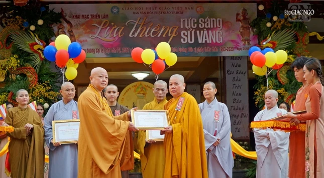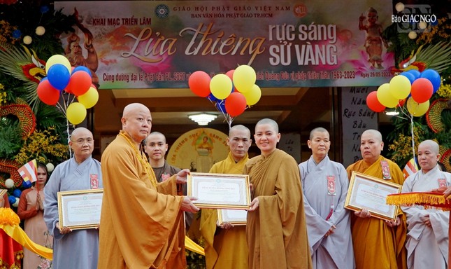 Dịp này, Ban Trị sự GHPGVN TP.HCM đã trao Bằng tuyên dương công đức đến thành viên Ban Văn hóa đã đóng góp tích cực cho các hoạt động trong Tuần lễ Phật đản TP.HCM.
