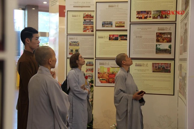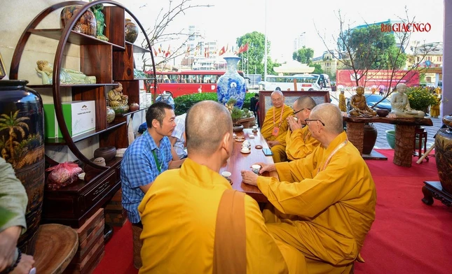 Sau nghi thức cắt băng khai mạc, chư tôn đức và đại biểu tham quan, thưởng lãm không gian triển lãm.