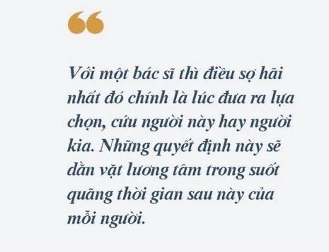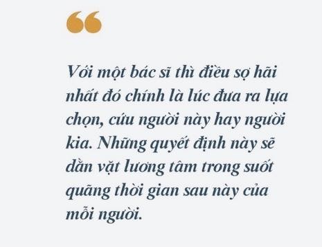 - Với một bác sĩ thì điều sợ hãi nhất đó chính là lúc đưa ra lựa chọn, cứu người này hay người kia. Những quyết định này sẽ dằn vặt lương tâm trong suốt quãng thời gian sau này của mỗi người. Tôi từng nghĩ sẽ không chịu được sự khốc liệt đó khi đi vào cuộc chiến.