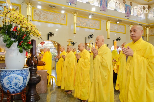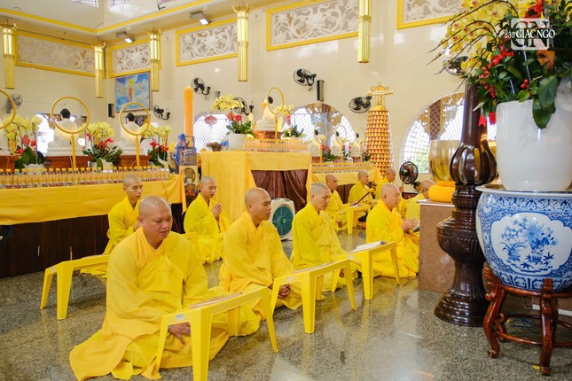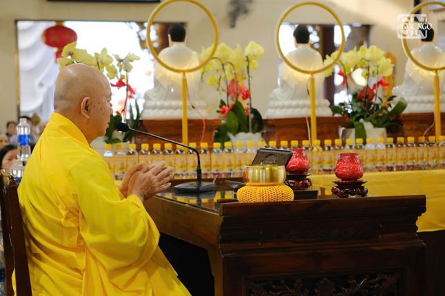 Đúng 7g30, Hòa thượng Thích Hoằng Tri, trụ trì chùa Vạn Đức, đăng lâm truyền Bát quan trai giới. Các hành giả trong đạo tràng đồng phát nguyện thực hành hạnh ly dục, giữ giới thanh tịnh một ngày một đêm như người xuất gia.