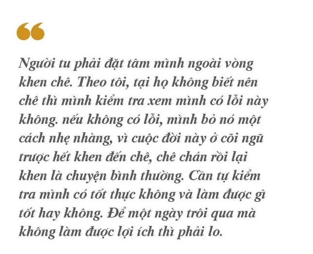 Các thiền sư tu hành nỗ lực thực tập cho được cuộc sống không lệ thuộc vật chất và tình cảm. Quán sát xem khi được đề cao, mình có sướng không và khi người ta nói lời thô ác, mình có buồn giận không. Người tu phải đặt tâm mình ngoài vòng khen chê. Theo tôi, tại họ không biết nên chê thì mình kiểm tra xem mình có lỗi này không. nếu không có lỗi, mình bỏ nó một cách nhẹ nhàng, vì cuộc đời này ở cõi ngũ trược hết khen đến chê, chê chán rồi lại khen là chuyện bình thường. Cần tự kiểm tra mình có tốt thực không và làm được gì tốt hay không. Để một ngày trôi qua mà không làm được lợi ích thì phải lo. Hòa thượng Đệ tam Pháp chủ Thích Phổ Tuệ dạy rằng sống lâu hay chết sớm không quan trọng, sống lâu để tạo phước đức hay sống lâu để tạo nghiệp là điều cần suy nghĩ.