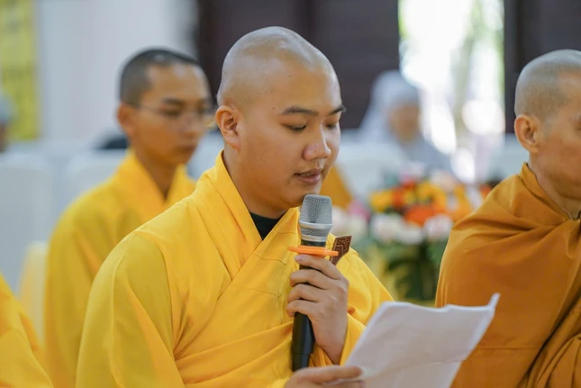 Sau phát biểu khai mạc của Thượng tọa Thích Vạn Trí, Phó Hiệu trưởng nhà trường, Thượng tọa Thích Đồng Thanh thay mặt Ban Giám hiệu trình bày báo cáo tổng kết khóa XIV (2022-2025).