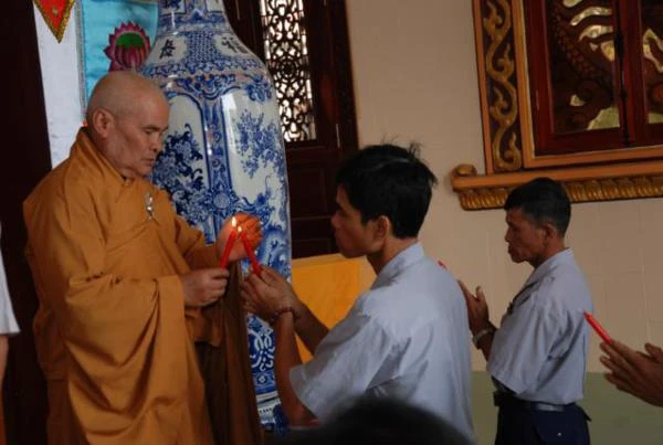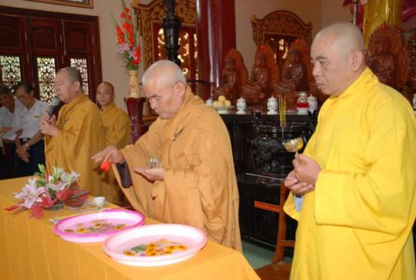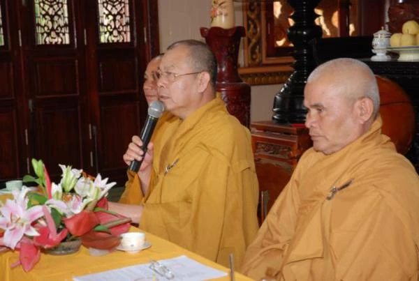 Sau phần tuyên đọc quyết định và nghi thức thọ cấp, TT. Thích Không Trú thay mặt Ban Trị sự ban đạo từ tán thán công đức đóng góp của các anh chị huynh trưởng trong thời gian qua, Thượng tọa mong mỏi các anh chị tiếp tục nỗ lực tu dưỡng và rèn luyện để hướng dẫn đoàn sinh, xây dựng tổ chức GĐPT ngày càng vững mạnh.