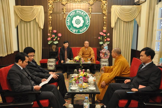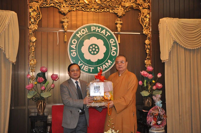 GNO - Sáng 16-1, tại Trụ sở GHPGVN, chư tôn đức Ban Thường trực HĐTS đón tiếp các vị lãnh đạo, đại diện các cơ quan, ban ngành đến chúc mừng nhân dịp xuân mới Nhâm Thìn.